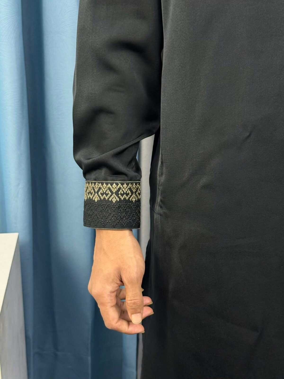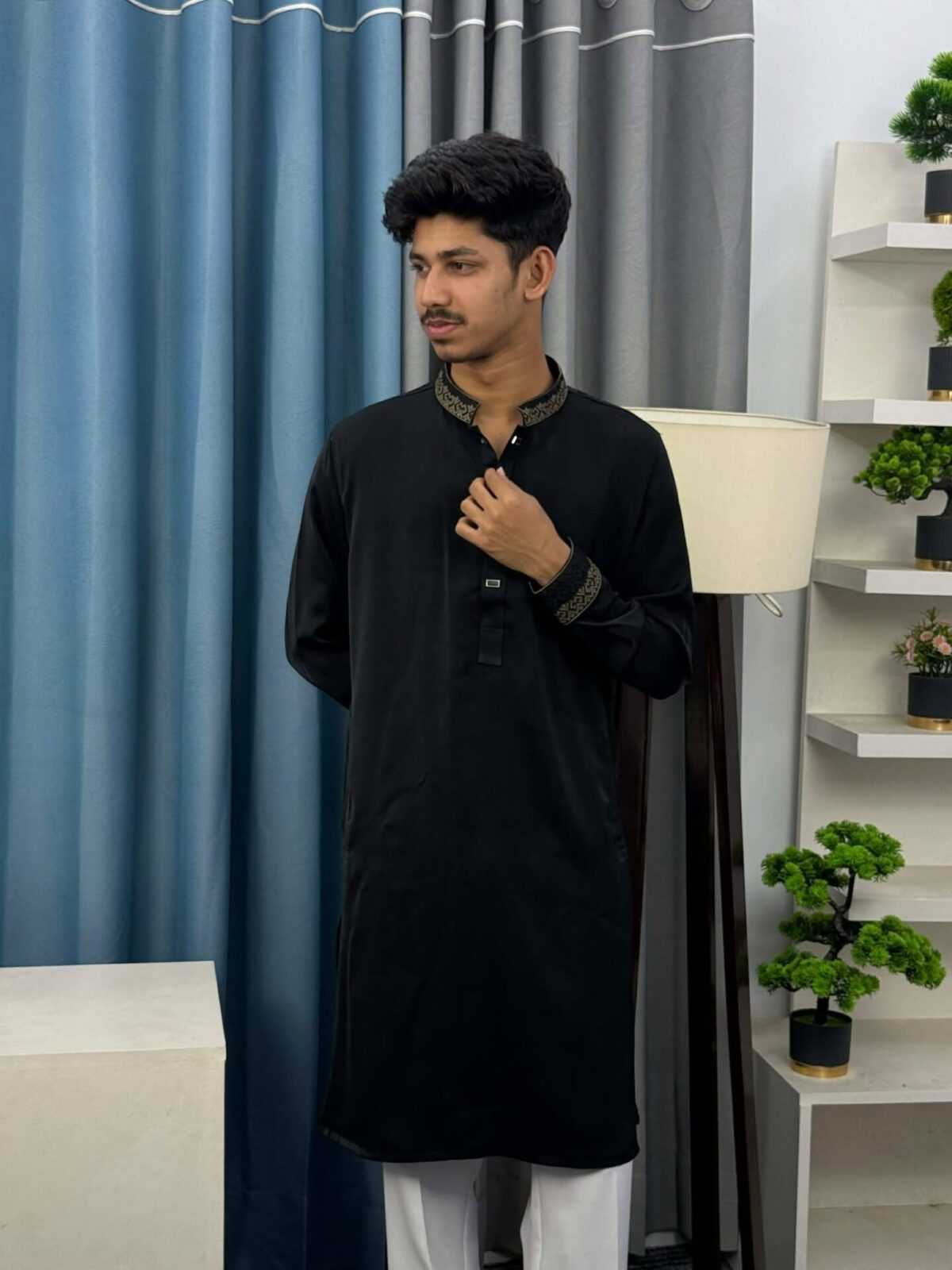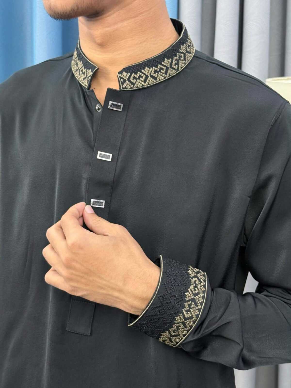 Upgrade your traditional wardrobe with this Premium Black Embroidered Panjabi for Men. Made from high-quality Royal Satin fabric, this Panjabi offers excellent comfort, breathability, and a stylish traditional look. The elegant embroidered collar and cuffs add a premium touch, making it perfect for Eid, Jummah, weddings, festivals, and special occasions.