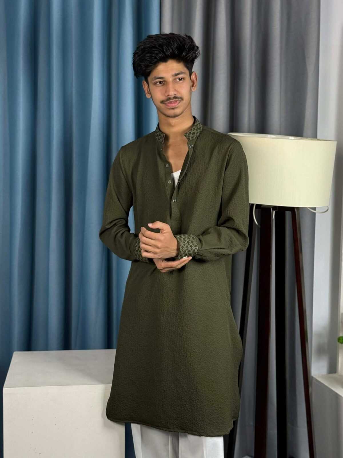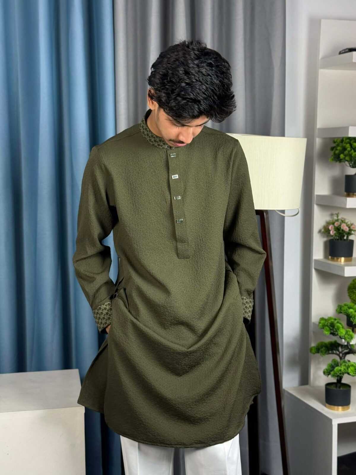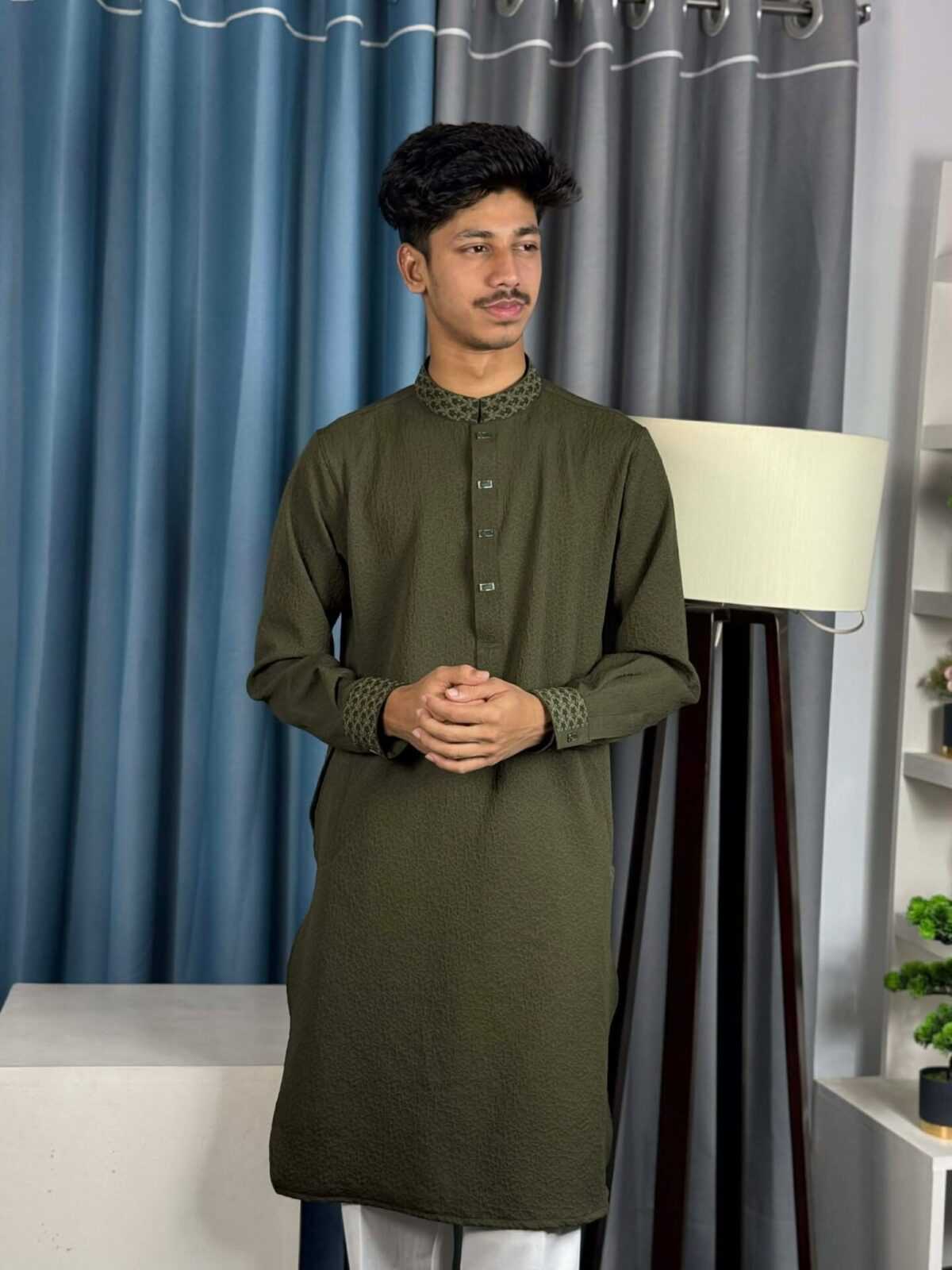 Upgrade your traditional wardrobe with this Premium Moss Green Embroidered Panjabi for Men. Made from high-quality China Imported Popcorn Texture fabric, this Panjabi offers excellent comfort, breathability, and a stylish traditional look. The elegant embroidered collar and cuffs add a premium touch, making it perfect for Eid, Jummah, weddings, festivals, and special occasions.