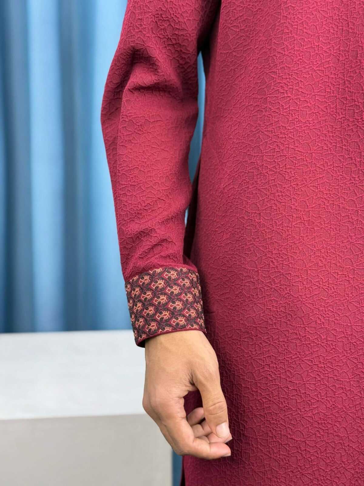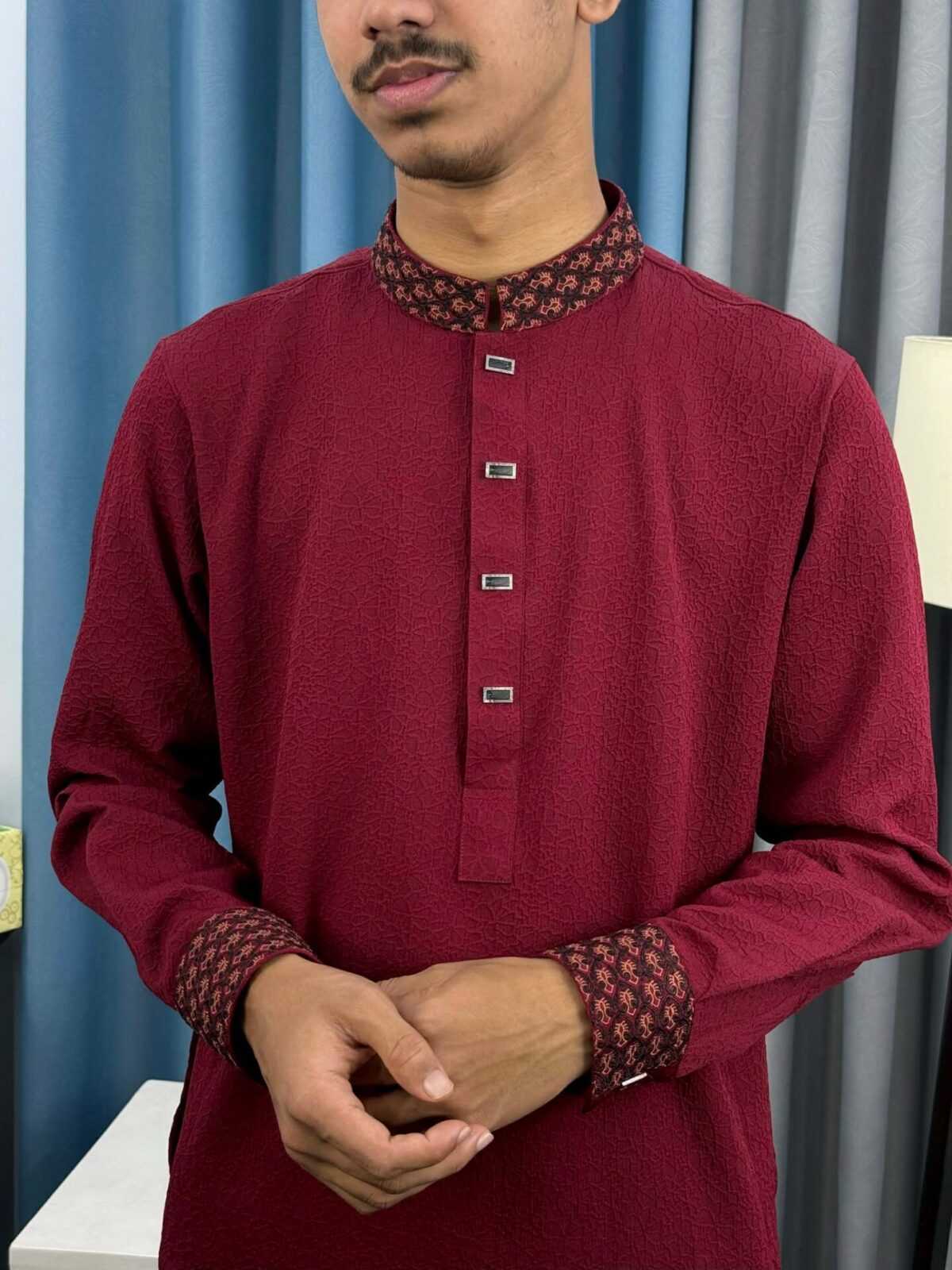 Upgrade your traditional wardrobe with this Premium Maroon Embroidered Panjabi for Men. Made from high-quality China Imported Popcorn Texture fabric, this Panjabi offers excellent comfort, breathability, and a stylish traditional look. The elegant embroidered collar and cuffs add a premium touch, making it perfect for Eid, Jummah, weddings, festivals, and special occasions.