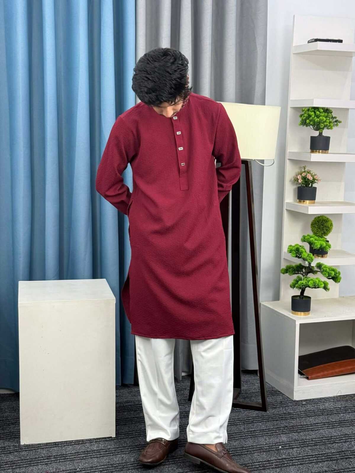 The lightweight China Imported Popcorn Texture fabric keeps you comfortable throughout the day, while the Maroon color gives a timeless and sophisticated appearance. Pair it with white pajama or trousers to complete a smart traditional outfit.