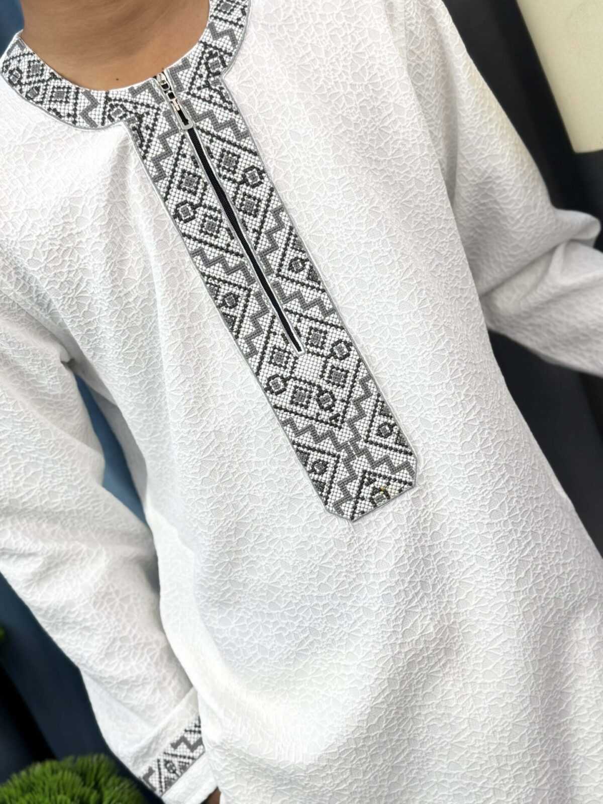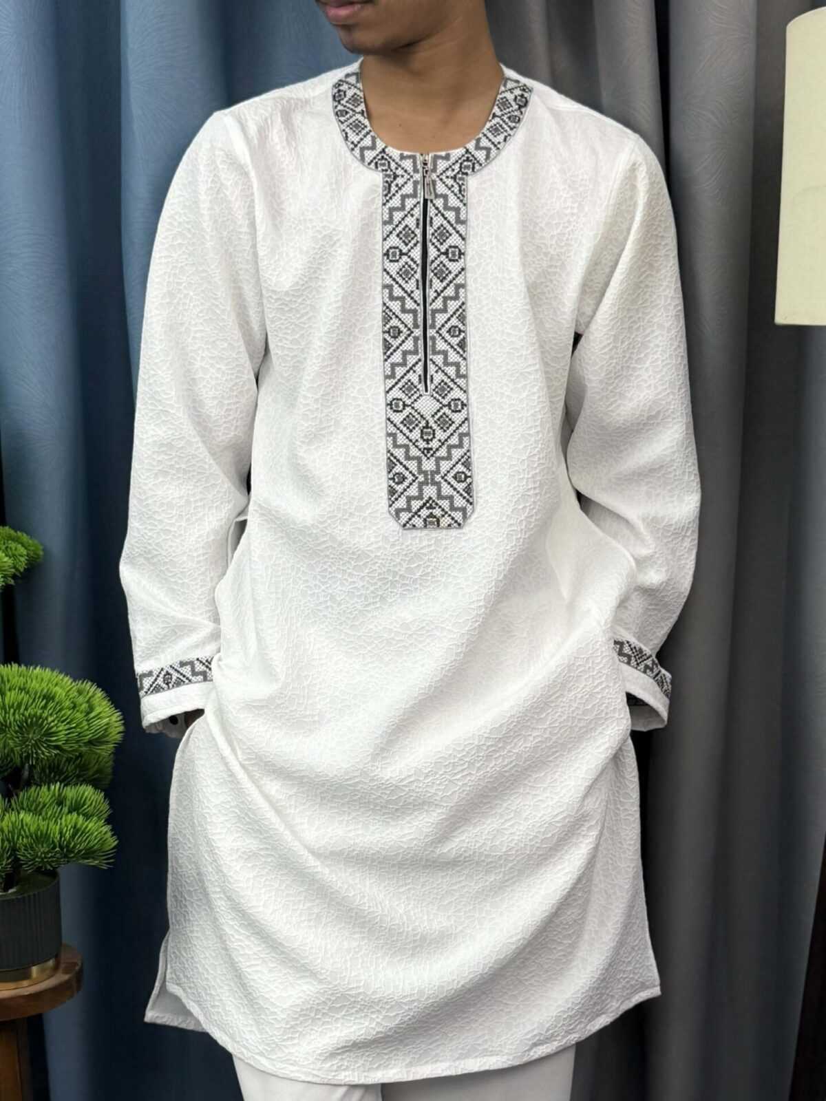 Designed with a modern round neck and a stylish cuff system, this Panjabi features eye-catching geometric embroidery on the chest placket and cuffs. The front zipper design adds a contemporary touch while maintaining a classic traditional vibe.