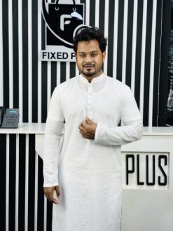 Designed with a modern round neck and a stylish cuff system, this Panjabi features eye-catching geometric embroidery on the chest placket and cuffs. The front zipper design adds a contemporary touch while maintaining a classic traditional vibe.