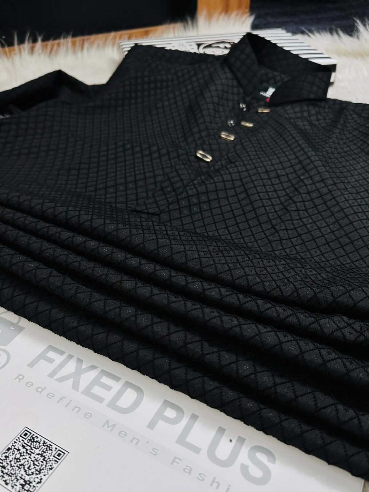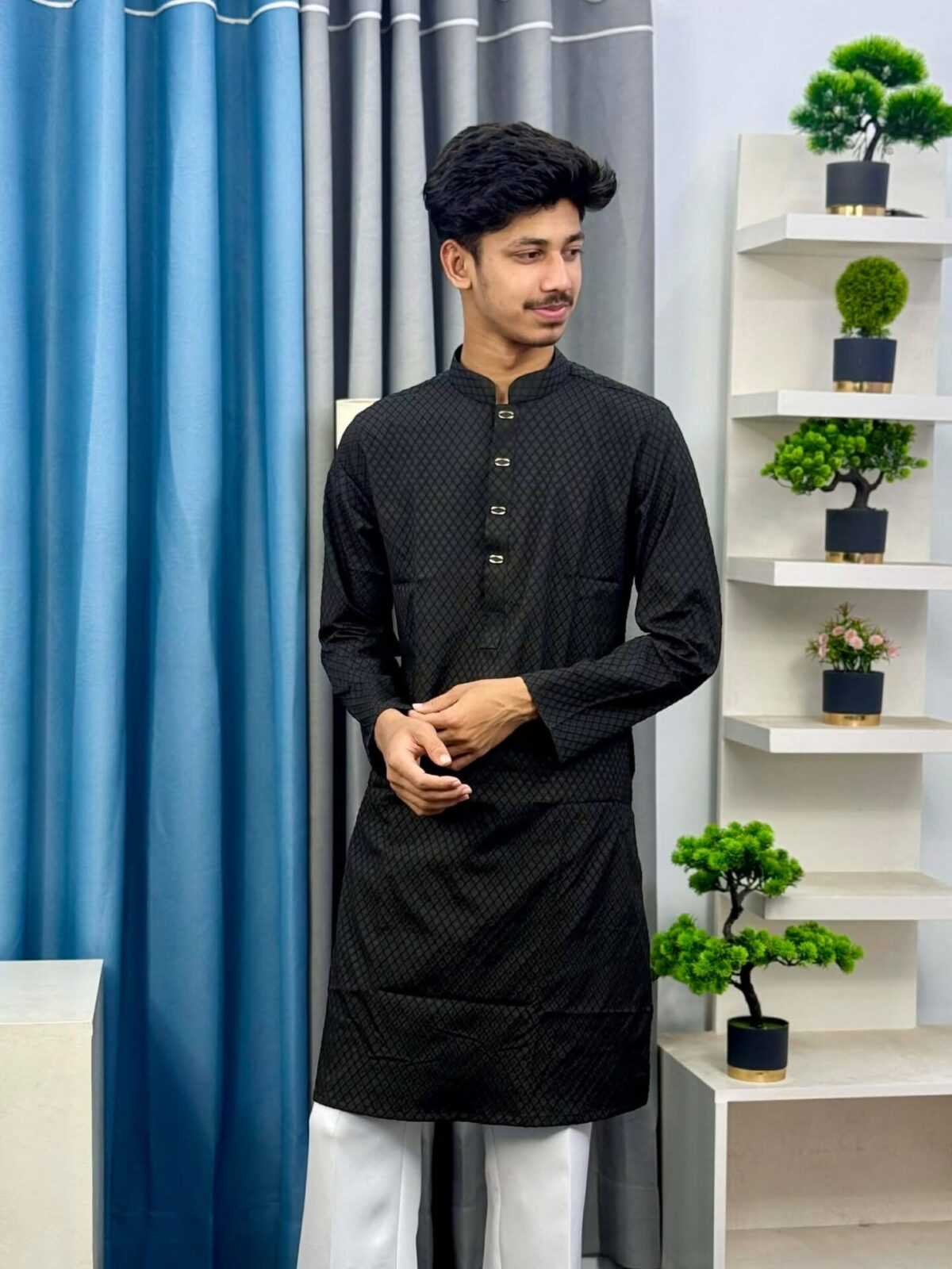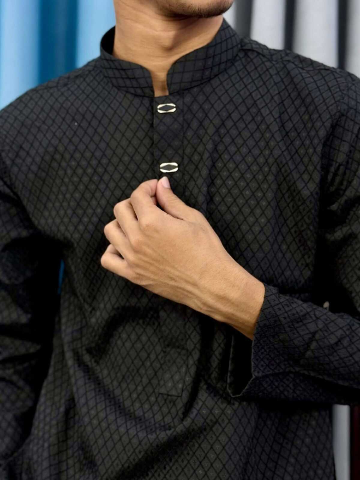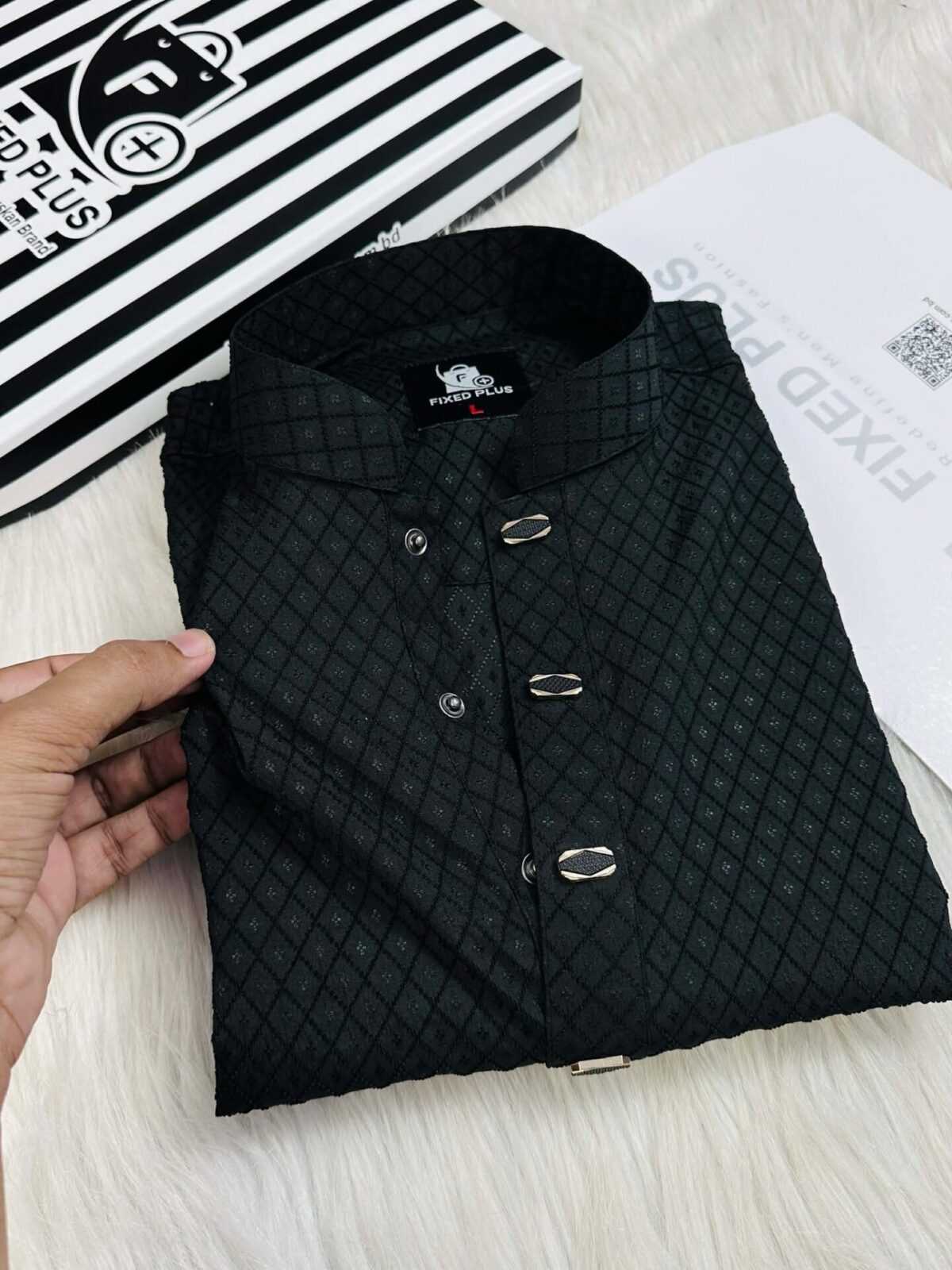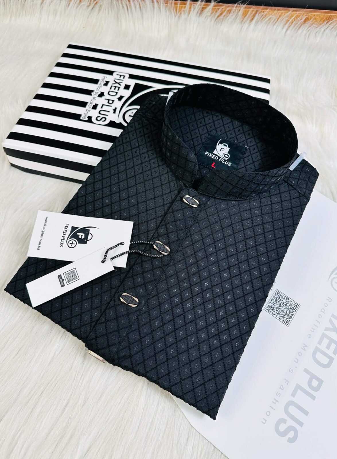 The Fixed Plus Premium Textured Panjabi – Black Edition is crafted for men who prefer elegance with a modern touch. Featuring a refined diamond-textured fabric and premium metal buttons, this Panjabi delivers a stylish yet traditional look suitable for any formal or festive occasion.