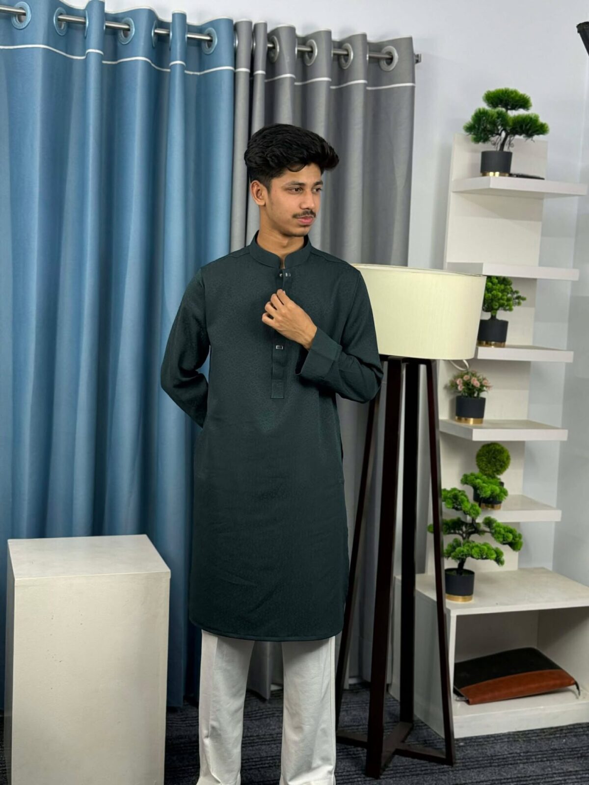The Royal Weave Panjabi – Dark Bottle Green Edition is crafted with a refined traditional design, enriched by premium detailing and modern tailoring. This Panjabi features a subtle woven texture, elegant metallic buttons, and a sophisticated cufflinks cuff design, making it a perfect choice for formal and festive occasions.