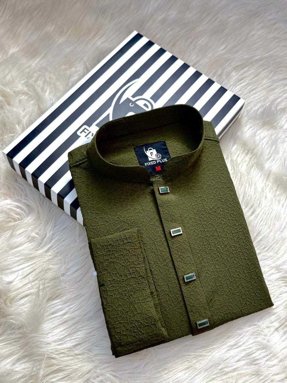 The Royal Weave Panjabi – Olive Edition is crafted with a refined traditional design, enriched by premium detailing and modern tailoring. This Panjabi features a subtle woven texture, elegant metallic buttons, and a sophisticated cufflinks cuff design, making it a perfect choice for formal and festive occasions.
